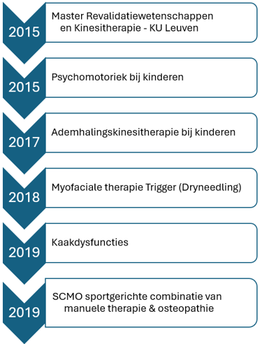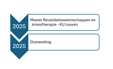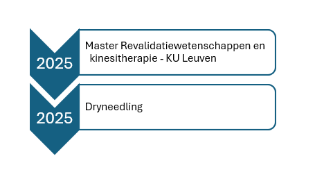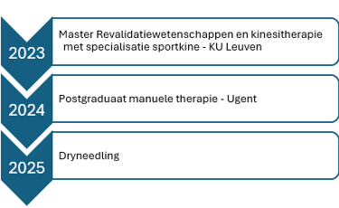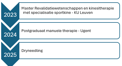 In dat jaar behaalde ik een master in de revalidatiewetenschappen en kinesitherapie aan de KU Leuven. Daarna volgde ik een postgraduaat manuele therapie aan de UGent, en ook dry needling kan ik inmiddels afvinken. Er staan nog heel wat opleidingen op mijn bucketlist, dus dit verhaal krijgt zeker nog een vervolg.